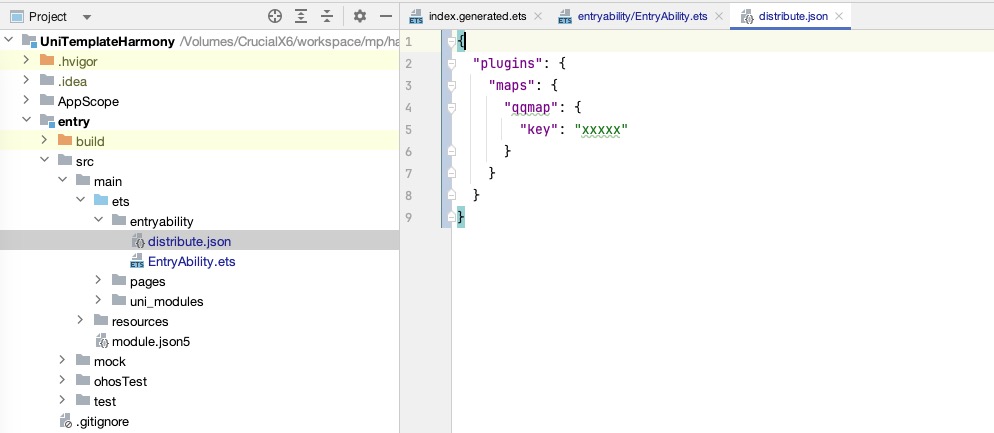 打开鸿蒙项目文件 /entry/src/main/ets/entryability/EntryAbility.ets,增加uni-app sdk初始化逻辑。这里引用了一个distribute.json文件,后续步骤中会讲解如何配置此文件。