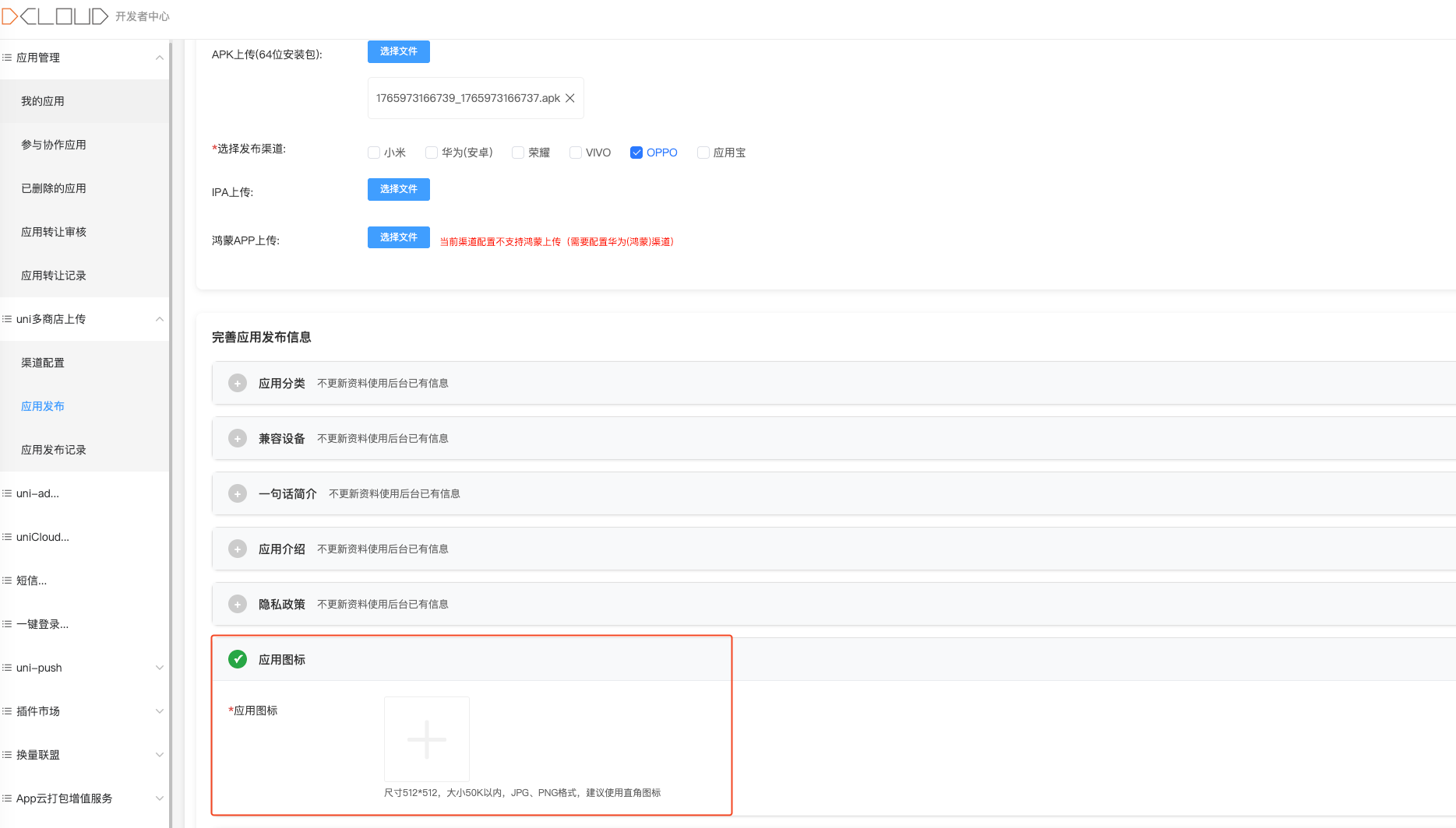 如果在 DCloud 开发者中心未上传图标或竖版截图,系统会使用 OPPO 开发平台已有的图标或截图。
