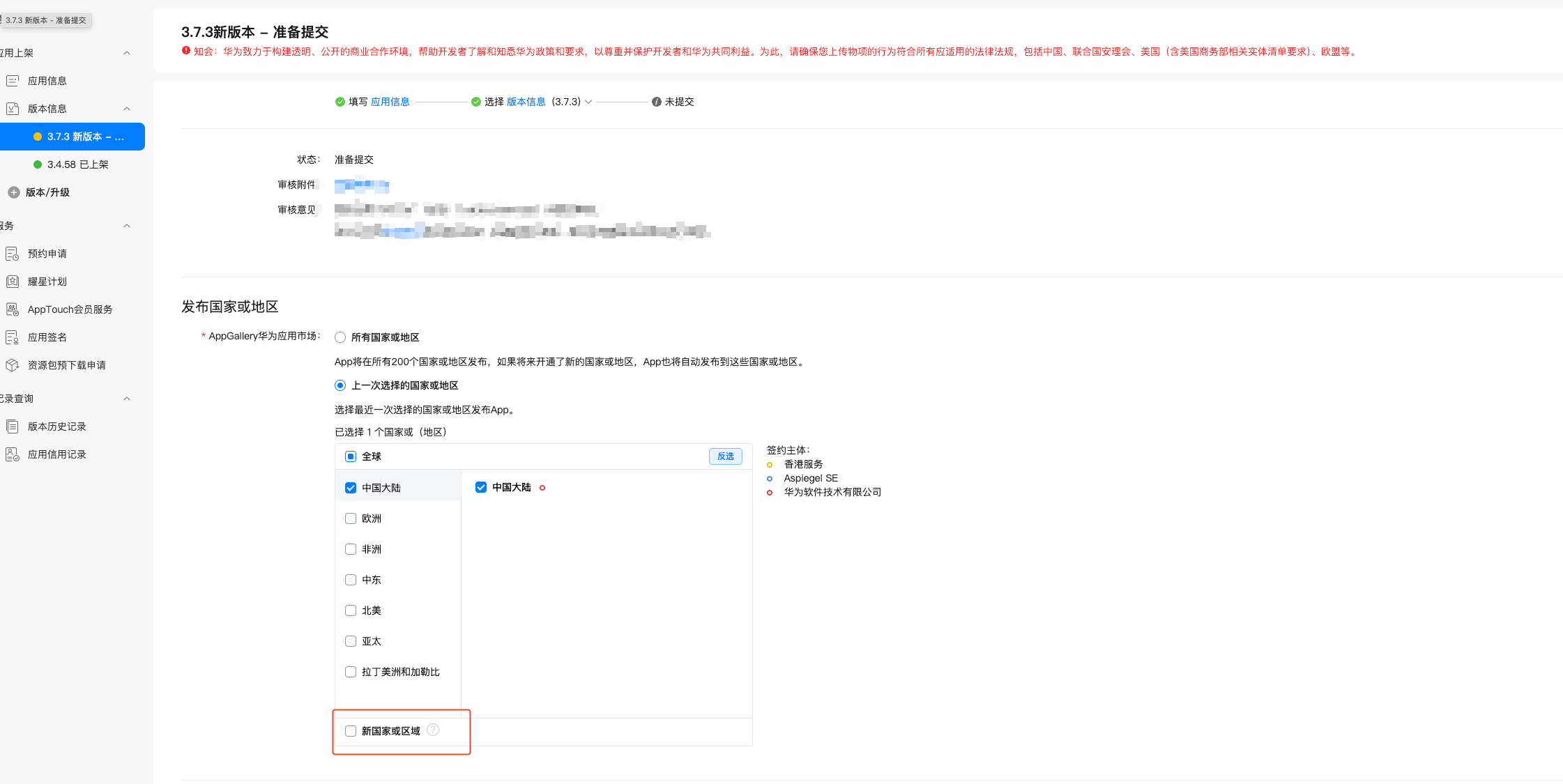 请登录 AppGallery Connect,在历史版本的应用信息中,检查已发布的国家或地区设置,确保没有选择“新国家或地区”。如果已被勾选,建议在本次应用更新时继续在华为开发平台发布,并将“新国家或地区”的勾选去除。之后,您可以在 DCloud 开发者中心重新发布应用版本。