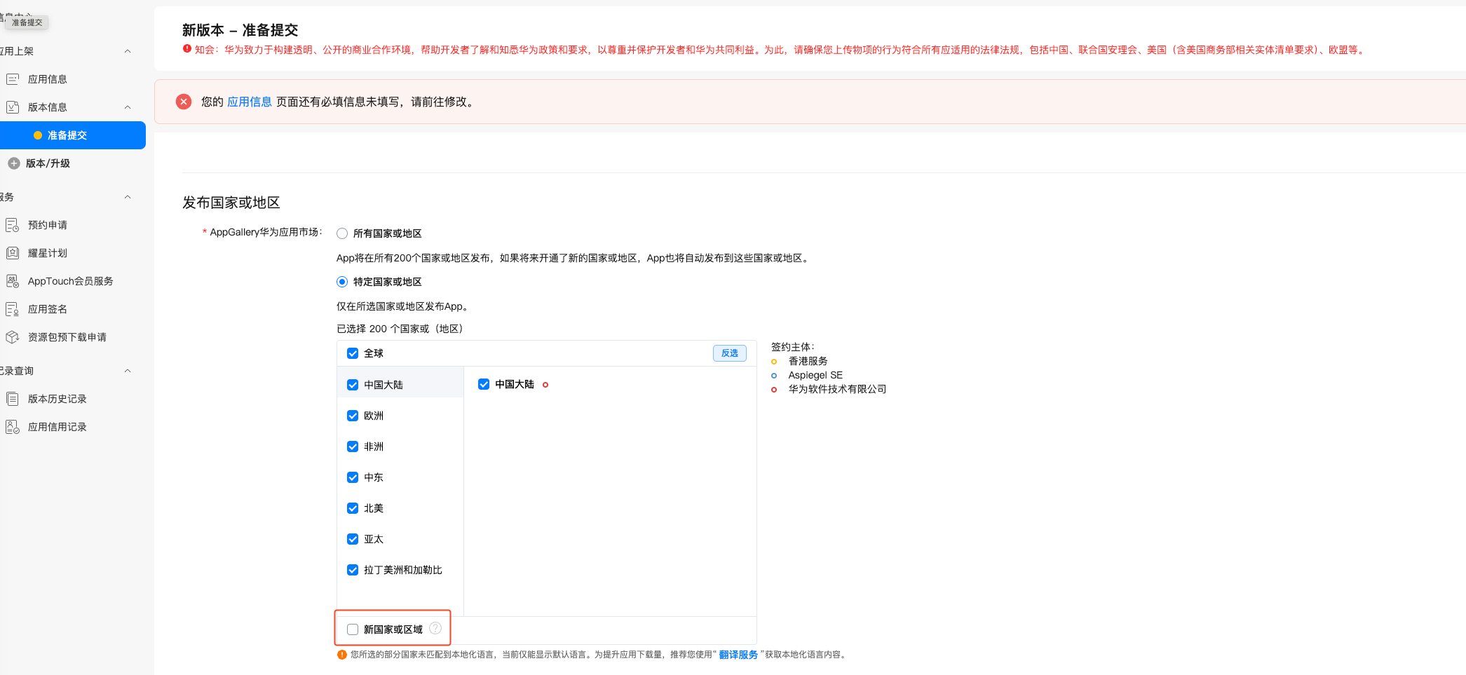 5.在已发布版本的国家或地区配置中,请确保未勾选“新国家或地区”选项。